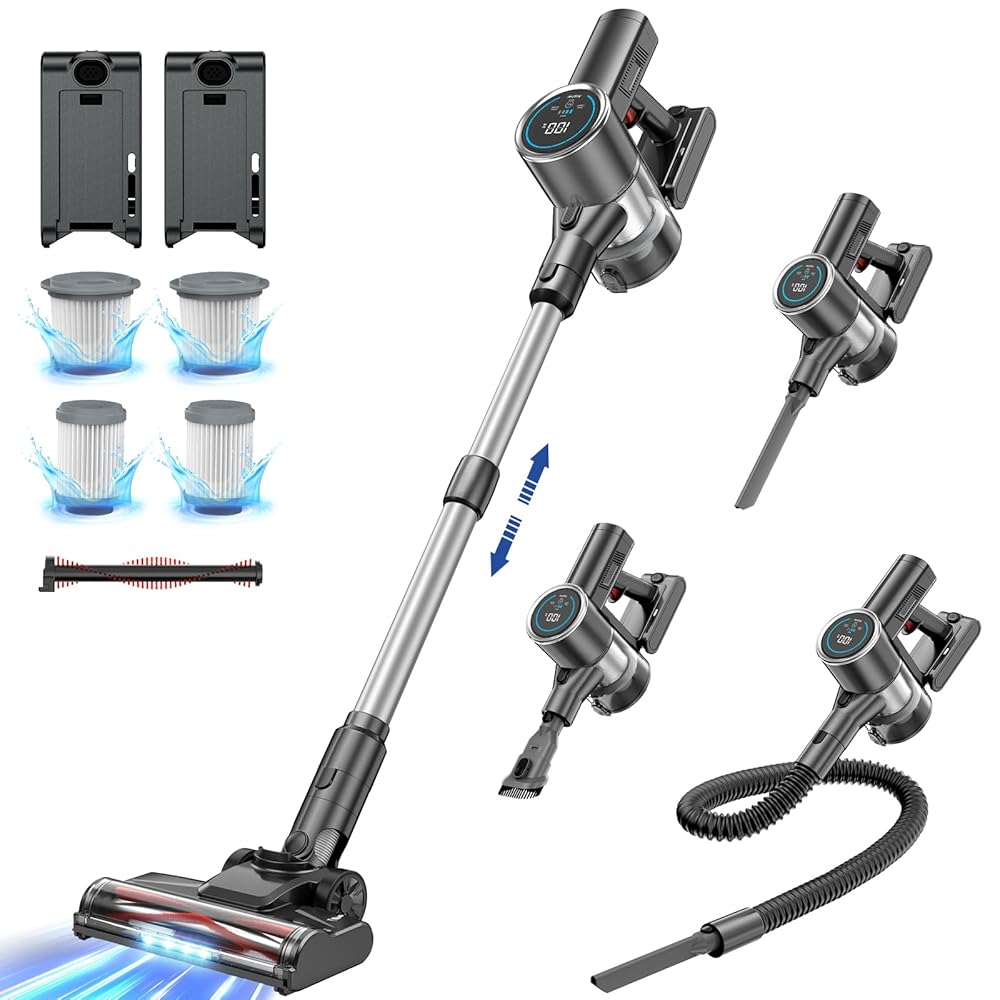 - High-Performance Updated Battery*2: Our cordless stick vacuum cleaner comes with 2 upgraded 2500 mAh batteries. We are providing up to 100 minutes of run time at standard mode (Two Batteries=100 Mins Runtime). You can quickly replace the depleted battery with a fully charged one and continue cleaning without waiting for charging time. Two removable batteries make it ideal for large homes or extended cleaning sessions, ensuring that the vacuum cleaner is always ready for use
