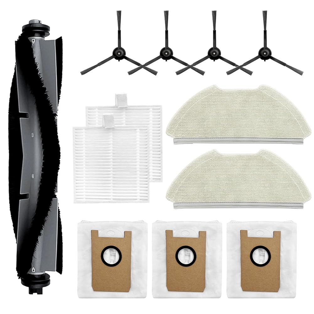 - [Value Replacement Kit]:1 Main Brush Roller+2 Filters+4 Side Brush+3 Dust Bags+2 Mop Pads(12 PCS)